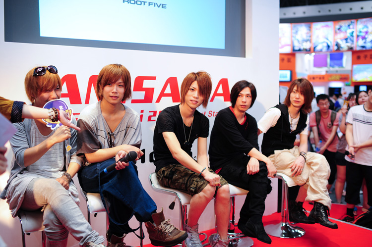 除了预约卷的销售外,ANISAMA的展台在开幕当天还迎来了一队重量级的嘉宾。活动开始前,展台已经被消息灵通的歌迷们围了个水泄不通,绝大部分歌迷都是年轻靓丽的女生,热情的阵势让不少路过的游人也禁不住驻足观看。伴随着一声声激动的尖叫,我们的主角————√5登上了展区的小舞台。「√5」(念作Root Five,根号五)由蛇足、ぽこた、み?ちゃん、けったろ、koma'n五人组成,五人皆为NICONICO上的超人气歌手,组成小队后愈发势不可挡,《三日月姬》和合唱版《千本樱》已经让大家充分领教了他们的实力。他们的到访,正是为了宣布√5也已确定会参加今年的Anisama in Shanghai 2012演唱会。在当天的活动中,√5与众粉丝们亲密互动,并在握手会上与热情的歌迷一一交流,还在CCG的演出舞台上为大家带来了一场小型LIVE演出。