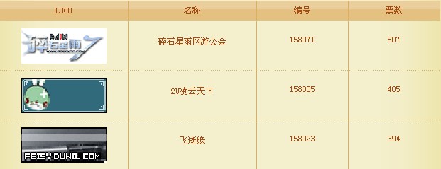 十大新锐公会的评选同样扣人心弦。继2U凌云天下之后,碎石星雨网游公会票数不断攀升,终于夺得了本周十大新锐公会本周排行榜第一。紧随其后的各家新锐公会竞争激烈,飞逝缘、神话网游公会、神堂联盟俱乐部、SoU灵魂公会、DK公会、凯旋帝国公会、西蜀王朝网游公会投票势头不减,当仁不让的栖身十大新锐前十名。