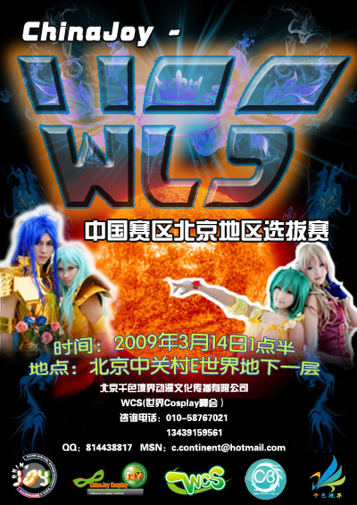 2009年度ChinaJoy-WCS中国赛区北京地区选拔赛将于本月14日下午1点半在北京中关村e世界数码广场A座负一层正式打响。在ChinaJoy组委会和ChinaJoy-WCS中国赛区北京地区选拔赛主办方北京千色境界动漫文化传播有限公司的大力宣传下,本次ChinaJoy-WCS中国赛区北京地区选拔赛比赛受到了全国广大动漫爱好者的热烈欢迎和全国青少年的广泛关注,同时也得到了各界媒体的积极响应。截至目前,北京赛区主办方已收到来自北京、天津等地区爱好者的报名表30余份,志愿者报名表100余份。