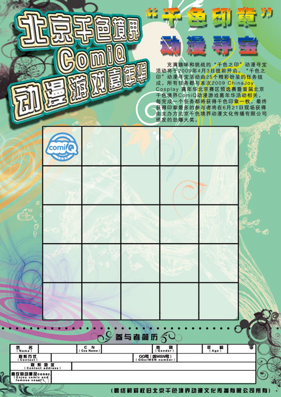 “千色之印”动漫寻宝活动由25个精彩纷呈的任务组成,所有任务都与本次2009 ChinaJoy Cosplay 嘉年华北京赛区预选赛暨首届北京千色境界ComiQ动漫游戏嘉年华活动相关,每完成一个任务都将获得千色印章一枚,最终获得印章最多的参与者将在6月21日现场获得由主办方北京千色境界动漫文化传播有限公司颁发的劲爆大奖。”