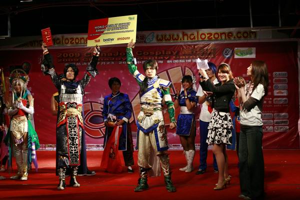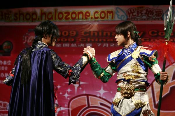 漫半拍:我们的节目节奏是这样,先是锣鼓经的开场,紧接一段任天堂8位机的一款经典格斗游戏《KONG FU》的游戏音乐,把观众带进一种经典和传统的回忆里面。再然后是中国著名武侠小说《笑傲江湖》改变的电视剧音乐,应该是98香港版中的音乐。动作上融入了醉拳,现代街舞,Wave多种动作元素。也表现了我所要的效果——新老文化结合的主题所产生的效果。最后是两个黑衣蒙面人摇身一变成为两个三国时期的猛将,完成一个完美的开场,随着激烈的音乐和音效,穿越时空把观众带到三国无双的战场,给大家视觉和听觉上都有极强的冲击力。这就是我所谓认为的,中国的COSPLAY应有的风格。