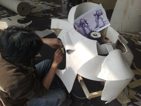 社团的骨干里以男丁居多,而且都偏好玩游戏,特别热衷的是暴雪出品的游戏,所以今年痛下决心出了一组名为“暴雪世界”的COS,这组剧由现任“世纪诺亚”负责人张翔带领,筹备了大半年,组织了30多个人,里面涵盖了大部分暴雪游戏中的经典角色,服装道具的难度也是有史以来最高的。虽说准备时间长,但是道具的工艺复杂,临近比赛的前一个月还是得天天加班,而且这组剧里新人也很多,对于道具制作的工艺一窍不通的也大有人在。“瓦斯琪”的鱼尾如何在台上行走,“蜘蛛女王”宽大的蜘蛛腿如何登上舞台,“机枪兵”一大堆装备的板型如何裁剪……等等头痛的问题堆积如山。不过生拉活扯的总算在比赛前一天准备妥当了。听到台下的欢呼声和大家兴奋的评论这是对“世纪诺亚”每个人最佳的回报。