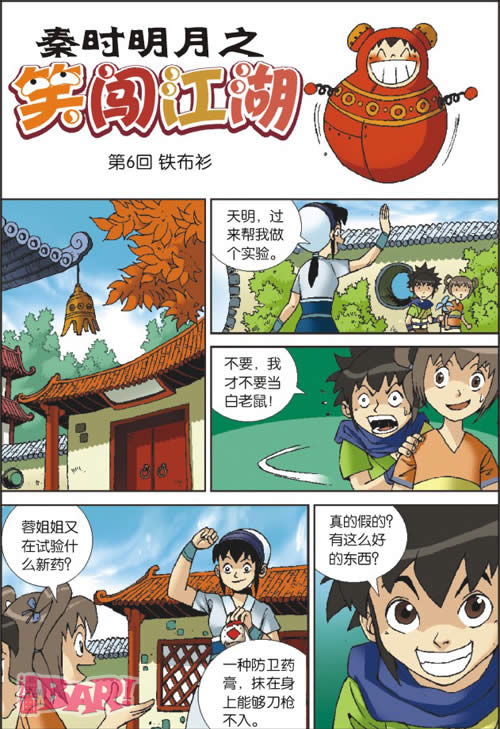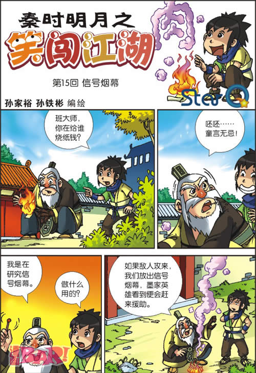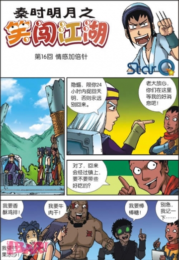 孙:《秦时明月之笑闯江湖》是一部搞笑短篇漫画,不同于长篇漫画,必须有持续发展的剧情,日本漫画中鸟山明的《阿拉蕾》、滕子不二雄的《多啦A梦》……都是类似的表现方式,一直在一个相同背景下发生出各种不同有趣的故事。《笑闯江湖》目前的故事场景并非机关城,距机关城尚有些距离,是一处人烟罕至的庄院,距人烟稠密的市镇和卫庄的基地都有些距离,这样安排,是为了使故事更好发挥,不致画地自限,缩小了故事发展的空间。其实,所谓的江湖也就是人类生活的范围,只要活着一天,就是人在江湖的日子。因此,剧中人物已经在闯荡江湖,搞笑的情节,已是笑闯江湖矣。