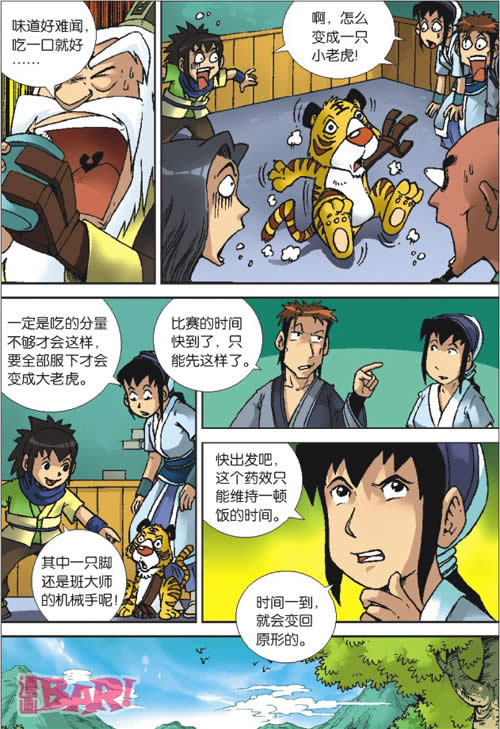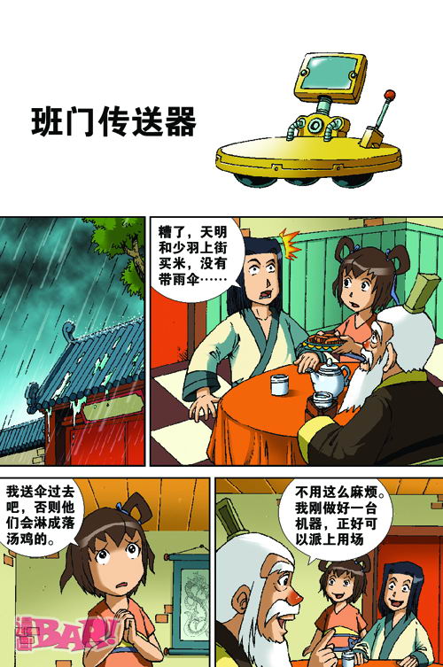 孙:由于动画中的班大师是一位巧匠,他制作了朱雀飞行器、白虎战车,因此我在搞笑漫画中将其特长发展成会发明各种东西的特异功能。这种情节,也一直是读者所乐见的故事方式,日本作品中的多啦A梦、国产动画的喜羊羊都是很好的例子。