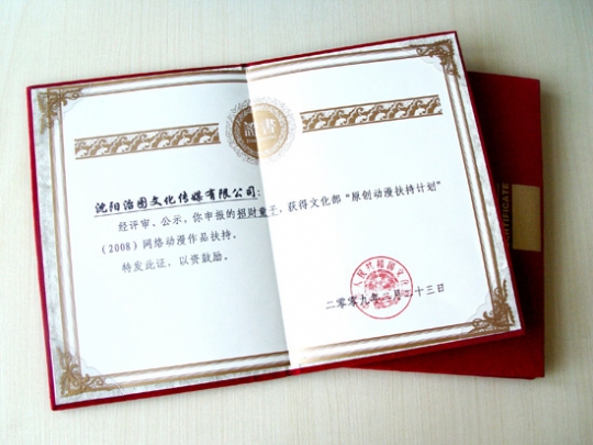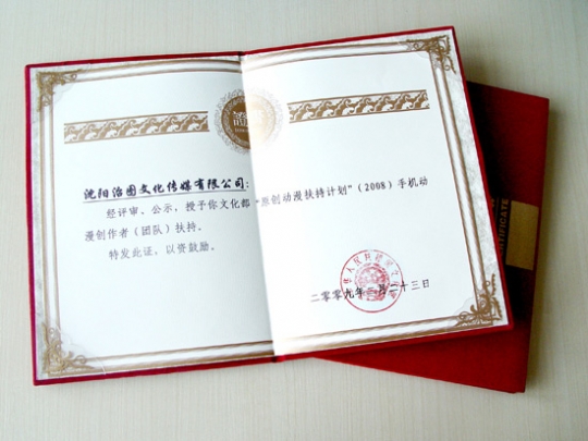 其中,沈阳治图文化传媒有限公司携旗下著名动漫品牌形象“招财童子”,一举获得文化部两项扶持。分别是“原创动漫扶持计划(2008)”网络动漫作品扶持和“原创动漫扶持计划(2008)”手机动漫创作者(团队)扶持,并获得10万元扶持资金。