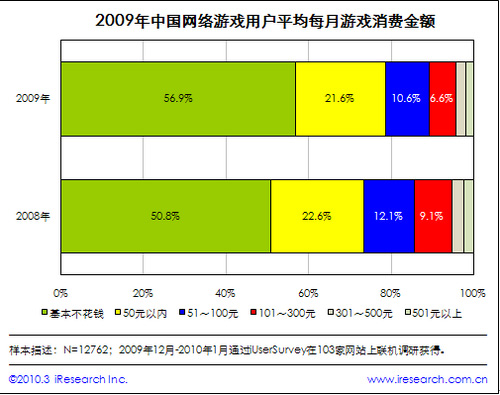 虽然数据显示用户收入正在逐步提高,但是用户在收入提高的同时,在网游方面的花费却有所减少。对比2008年的调研数据,在游戏中基本不花钱的用户比例上升了6.1%,达到56.9%。换言之,即2009年中国网游用户的付费玩家仅占43.1%,而在这付费用户中,每月消费超过101元的用户仅10.8%。