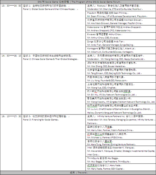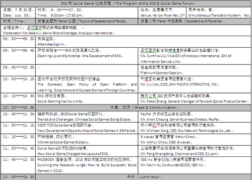 目前,本届CGBC SNS和Social Game论坛日程安排已基本确定,总日程详见:http://www.chinagbc.com.cn/Meeting_hyrc.aspx