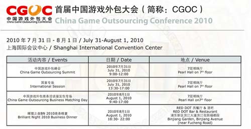2010年全球瞩目的世博会在上海举办,国际盛会必将吸引来自全球的嘉宾莅临。第八届中国国际数码互动娱乐展览会(ChinaJoy)、中国游戏商务大会(CGBC)、中国游戏开发大会(CGDC)和中国游戏外包大会(CGOC)将于世博举办期间的7月28日-8月1日在上海新国际博览中心和上海国际会议中心分别举行,此次一展三会盛况空前,必将吸引全球关注游戏产业的各类专业人士与爱好者的广泛参与,不仅要将中国的优秀游戏和技术展示给世界看,也要使其在沟通中外游戏产业商务和技术活动平台的“商务中心”作用更加强化和提升。
