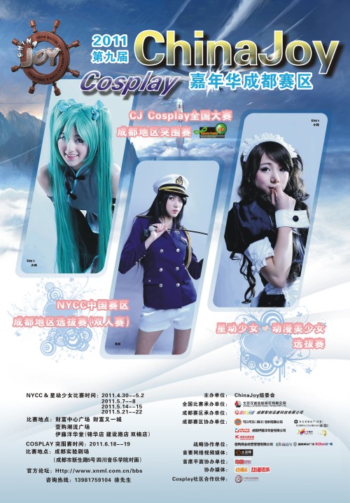 经过历时数月的准备,2011 ChinaJoy Cosplay 嘉年华成都赛区终于要在五一小长假期间与广大的爱好者见面。本次成都赛区首次尝试更多的与商业项目相结合,旨在扩大本次大赛的影响力,以及更好的回馈广大参赛者的热情。