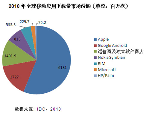 2010年在全球市场,Apple依然占据下载量份额的第一位,下载量达到61亿次,Google排在第二位,下载量达到17亿次,Nokia的下载量也有8.13亿次。从整体下载的状况来看,“终端+OS”厂商已经控制了整个移动应用产业链,而运营商及独立的软件商店的下载总量只有14亿次。