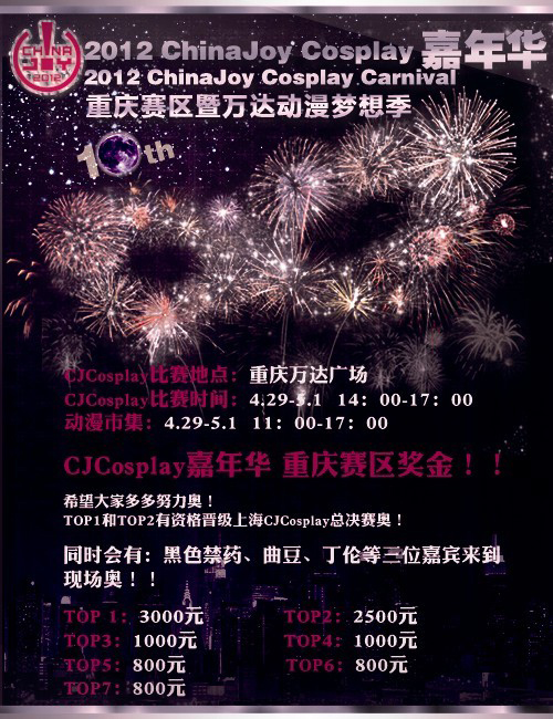 为了鼓励支持各个社团,这次比赛奖金也是很丰厚的!当然,本次重庆地区CJ预选赛的前两名队伍将获得前往上海参加2012 ChinaJoy Cosplay全国总决选!