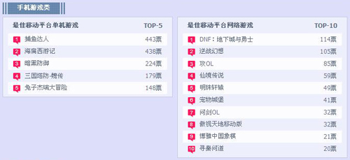 本周榜单中玩家最喜爱的十大网络游戏榜中变化不大,依旧被“九阴真经”独占鳌头,“倩女幽魂”“地下城与勇士”居于其次,后排的游戏想要跻身前三看来要付出更大的努力。最佳原创网络游戏榜中“斩魂”以微弱的差距超越“九阴真经”荣登榜首。玩家最期待榜单中“龙剑”“黑金”几乎齐头并进,而“洛奇英雄传”和“天下3”则分别领先最佳境外网络游戏榜与最佳3D网络游戏榜。网页游戏类中“卧龙吟”居于玩家最喜爱榜单首位,但“大侠传”“神曲”等游戏实力也同样不容小觑随时有赶超的可能。玩家最期待榜单中“萌三国”以颇大的差距拉开次位的“大将军”,不知道后期还能否保持此时的优势。手机游戏类榜单则相对较平稳,由“捕鱼达人”“DNF:地下城与勇士”平分最佳单机榜与最佳网络榜榜首,而暂时位列其次的众款游戏很有可能会后来居上。