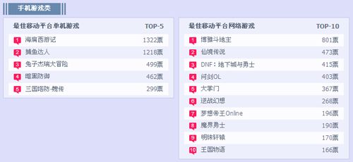 首先玩家最喜爱的十大网络游戏榜单中“九阴真经”“倩女幽魂”“地下城与勇士”始终占据前三甲的位置,不难看出玩家们对这三款游戏的情有独钟。而人气颇高的“剑侠情缘3”则被“成吉思汗3”和“画皮II”赶超,看来是处处不可松懈。玩家最期待的十大网络游戏榜单中“黑金”再次夺魁,一拥而上的“圣斗士星矢”“EVEonline”等游戏则在后方虎视眈眈随时有赶超的可能。最佳原创网络游戏榜中“斩魂”暂时领先,但以“九阴真经”和“成吉思汗3”的增长幅度来看之后可能又是另一番景象。最佳境外网络游戏榜中变化不大,“洛奇英雄传”稳居首位,而“梦幻诛仙2”则在最佳Q版网络游戏榜中遥遥领先,居后的游戏压力可想而知。页游方面“卧龙吟”“大侠传”“神曲”等游戏在玩家最喜爱的网页游戏榜上暗暗较劲,同时在玩家最期待的网页游戏榜上首位的“萌三国”则被黑马“童萌镇”紧追不舍。手游部分在最佳移动平台游戏榜单中“海扁西游记”和“捕鱼达人”始终在冠、亚位上争夺输赢,而“博雅斗地主”则逆流而上,占领本周最佳移动平台游戏榜首。