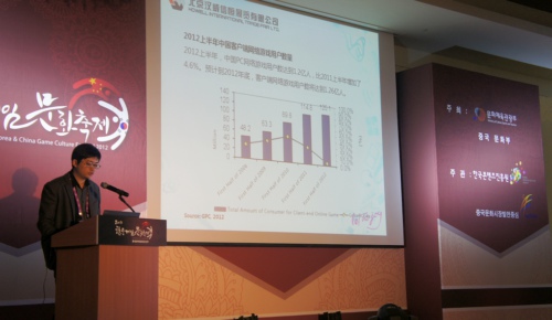 于昆先生结合ChinaJoy在中国多年来一直扮演的游戏产业平台经验,对中国游戏市场当前的发展情况进行了阐述,内容涵盖客户 端网游,网页游戏,移动游戏,未来发展趋势,中国游戏海外出口,当前中国与世界其他游戏产业的交流互动等方面,并分享了 很多宝贵的数据,发言受到了众多韩国游戏公司的热情响应。