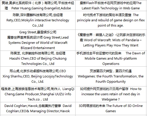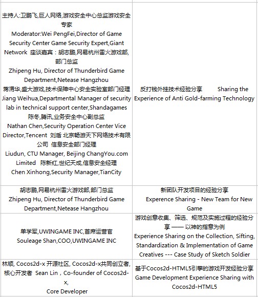 在17日即将播出的CGDC视频中,CGDC 2012主题演讲人Havok的总裁兼执行董事David Coghlan所带来的是其关于3D网络游戏的未来的见解。除此之外,奥多比系统软件(北京)有限公司平台技术经理黄竣将带来最新Flash平台技术在网页游戏中的应用介绍;深圳墨麟科技有限公司总经理陈默将介绍“时代拐点下游戏的策划本源及重塑”;暴雪娱乐公司魔兽世界首席系统设计师Greg Street将介绍《魔兽世界:熊猫人之谜》中如何让玩家决定游戏的乐趣;北京触控科技有限公司总经理陈昊芝将阐述其关于“手机游戏全平台运营时代的到来”的见解;北京乐动卓越科技有限公司CEO邢山虎将介绍页游第四次转型所带来的第四次机遇;上海游族信息技术有限公司制作人程良奇带来的是如何提升网页游戏的次日用户留存;网易杭州雷火游戏部部门总监胡志鹏将对新团队开发项目的相关经验分享;UWINGAME INC首席运营官单学军的演讲题目是:“游戏创意收集、筛选、规范及实施过程的经验分享--以神的指意为例”;Cocos2d-x 开源社区Cocos2d-x共同创立者核心开发者林顺带来的是基于Cocos2d-HTML5引擎的游戏开发经验分享;除单人的讲解外,由巨人网络游戏安全中心总监游戏安全专家卫鹏飞主持的“反打钱外挂技术经验分享”请来了网易杭州雷火游戏部部门总监胡志鹏、盛大游戏技术保障中心安全实验室部门经理蒋渭华、腾讯业务安全中心副总监陈冬、北京畅游天下网络技术有限公司信息安全部门经理刘盾和世纪天成信息安全经理陈新红将为大家带来他们的相关见解。