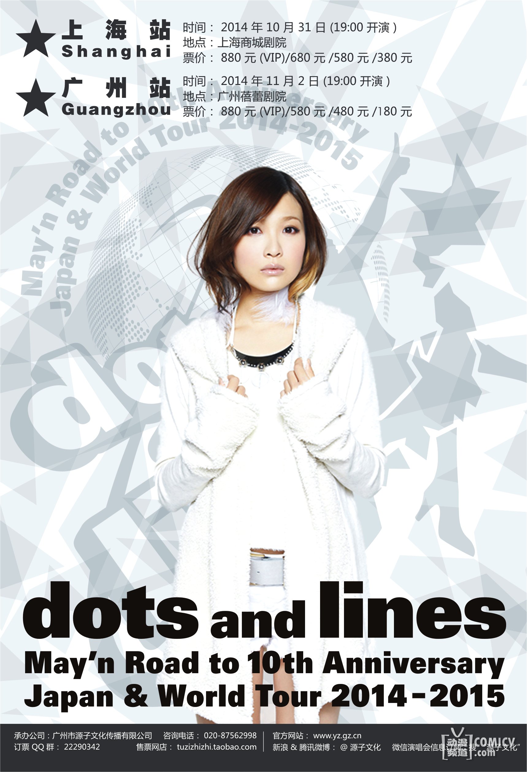 银河歌姬雪莉露May’n Road to 10th Anniversary Japan & World Tour 2014-2015 『dots and lines』中国上海&广州站将于2014年10月31日和11月2日分别于两个中国城市开唱,场地选择在大家熟悉的上海商城剧院和广州蓓蕾剧院。