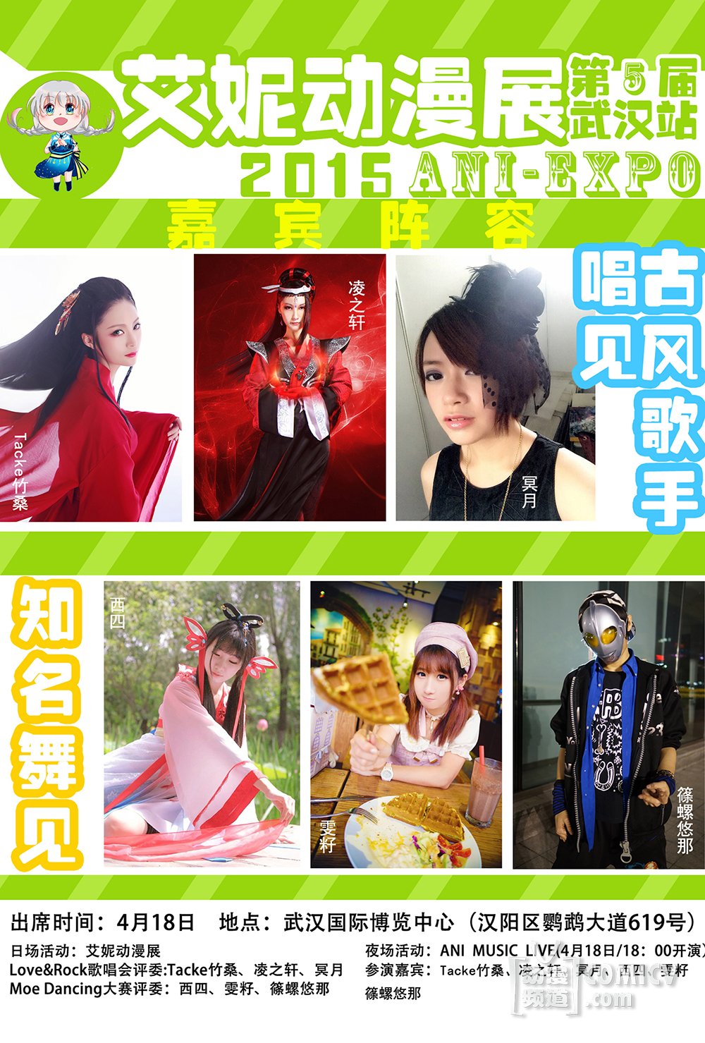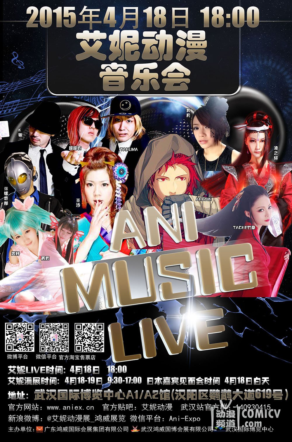 ANI MUSIC LIVE(艾妮动漫音乐会)!邀请了国内的多位人气嘉宾,如古风歌手:TACKE竹桑、凌之轩;国内唱见:冥月 ; 国内舞见:雯籽、西四、螺主任前来助阵,更有日本实力唱见赤ティン(akatin)以及日本的超人气舞蹈团队“PCF”主力成员(けいたん、ただのん、TAKUMA),和乐器(?沙)共同出席!多首经典动漫歌曲与精彩的舞蹈演出将会在武汉国际博览中心全新演绎,超豪华的海内外阵容超多经典曲目与精彩的舞蹈表演将会贯穿全程演出,让大家度过一个难忘之夜!