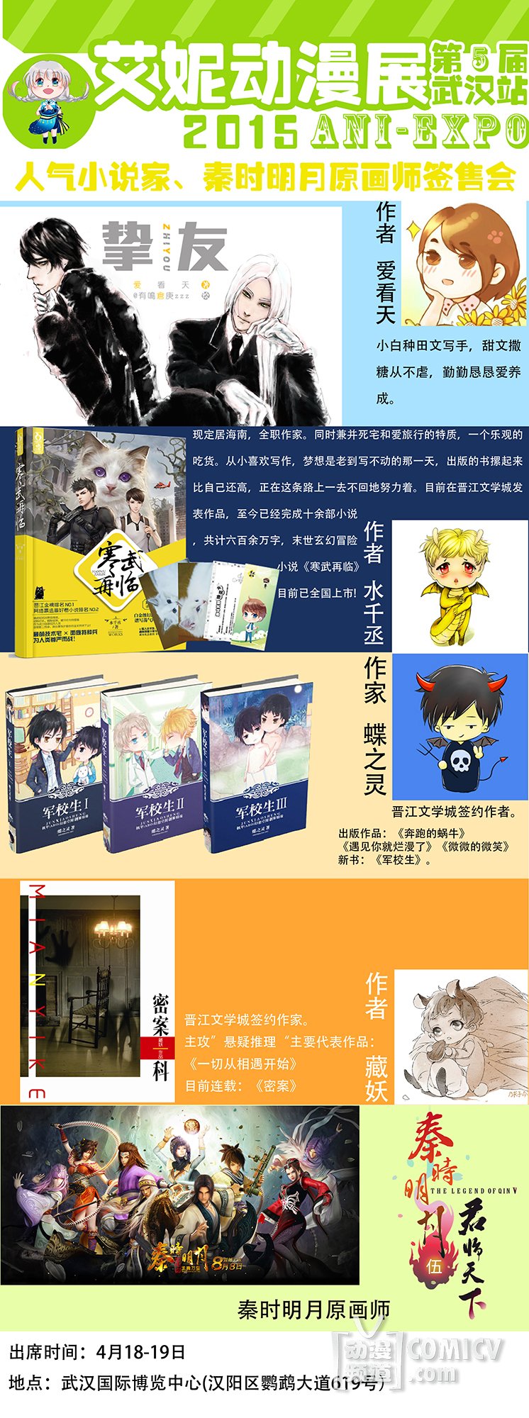 人气小说家:爱看天、水千丞、蝶之灵、藏妖作品签售;更有秦时明月原画师空降现场;书迷们想要喜欢的大大的签名或者签绘的话千万不能错过4月18-19日了哦~