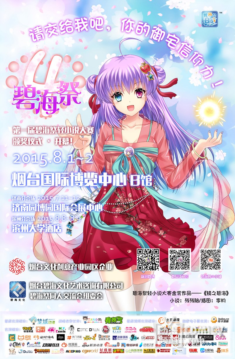 2、分会场大作战:本次碧海祭已确定两处省内分会场:济南分会场——7月11-12日,济南园博园国际会展中心,萌荷3夏日同人祭;滨州分会场——8月8-9日,滨州大学酒店,凤鸾滨州FL夏日祭。碧海娘将会亲临现场与当地小伙伴们互动!一起High起来吧~!