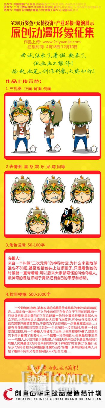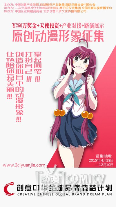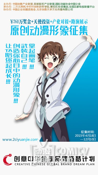 每一个人都拥有自己的梦想。为了鼓励更多有梦想的人实现自己的梦想,由中国创意产业联盟、首都版权产业联盟、国际动画协会中国分会主办,赛伯乐投资集团、中关村创新研修学院、二次元界网、全国百家电视台联播平台承办,中国企业投融资商会、北京创音天承文化传播有限公司协办的“创意中华2015全球品牌造梦计划原创动漫形象征集活动”已经进行了一个月了,收到作品上百个。笔者八年来一直研究国内的各种动漫赛事,此活动的比赛模式和奖项设置完全不同一般的动漫比赛。为此,笔者对承办方二次元界网副总经理李洋先生(网名御京鬼丸、丸子)进行了当面采访。李洋先生就创意中华活动、中国创意天使投资团发起的寻找100个有梦想的动漫大咖活动进行了更一步的说明,并向动漫作者们提出邀约。