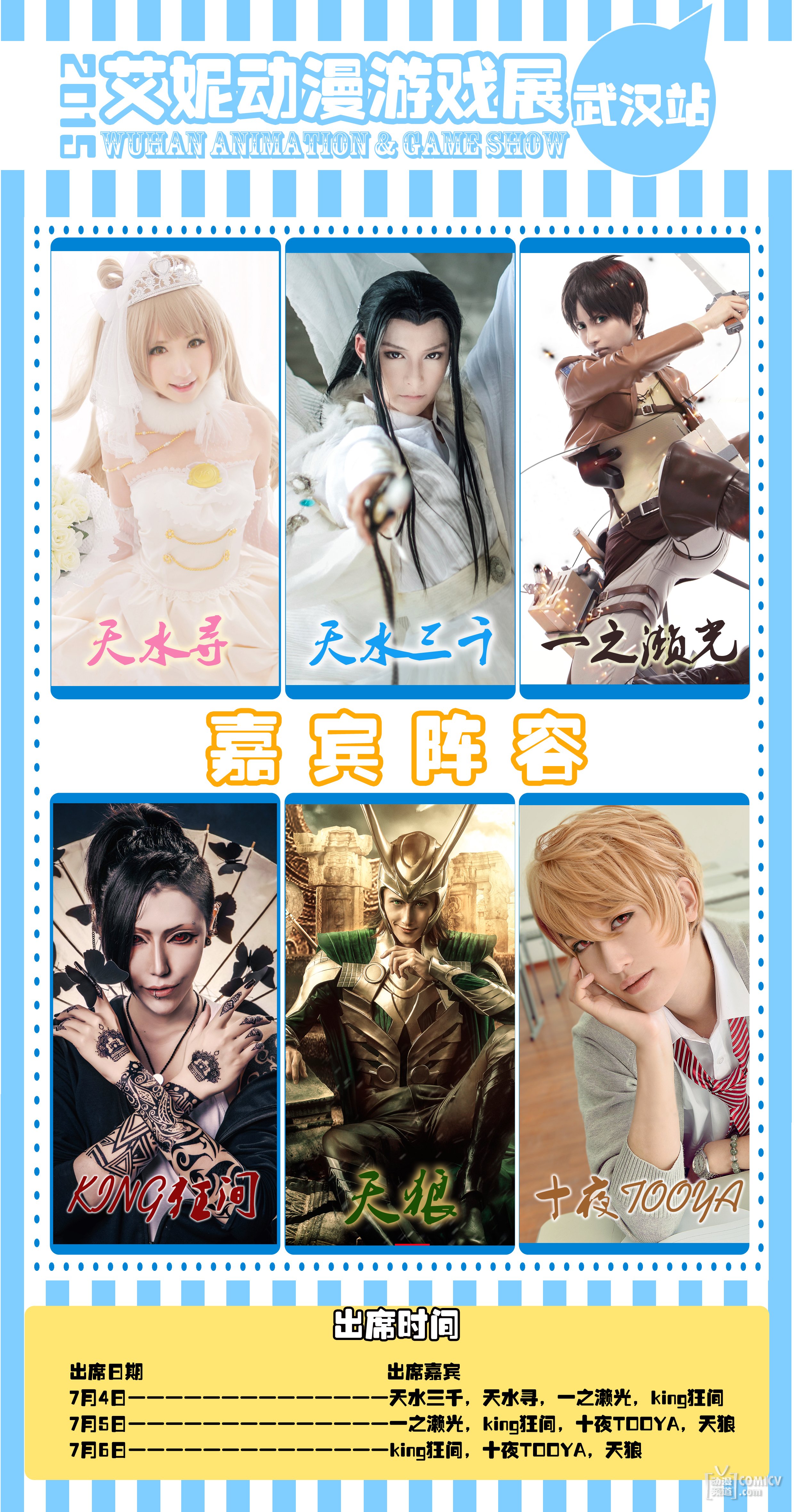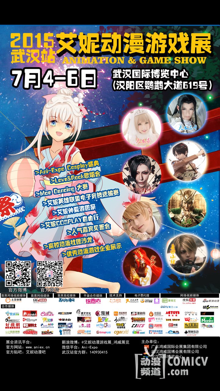 第七届艾妮动漫展将于7月4-6日武汉国际博览中心举办,本届动漫展邀请了多位知名人气嘉宾:杭州304社团天水三千&天水寻、宝岛台湾人气coser King狂间、著名多元化专业coser 十夜TOOYA、知名动漫展会主持人天狼、 国内人气coser 一之濑光,当然少不了我们的好朋友真田小猪以及少少。