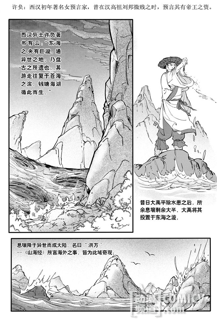 西汉异士许负著书有云:“东海之央有巨漩,通异世之地;乃盘古之所遗也,其游走往复于苍海之滨,钱塘海湖循此而生。“
