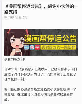 今日,以漫画阅读和二次元社交为主打的移动阅读产品漫画帮在官方平台上发布消息称将于2016年1月1日正式停止运营。这一消息给原本并不明朗的动漫产业又一个不小的震荡。