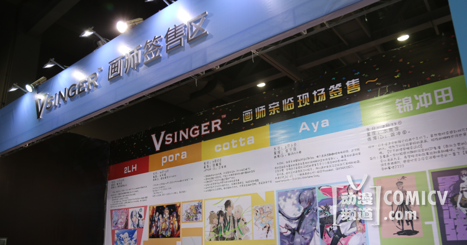 Vsinger联合展位特邀 2LH、pora、Aya、cotta、锦冲田五位知名Vsinger画师到现场进行签售活动。粉丝们可以与平时在网上见图不见人的画师大大们近距离接触、交谈,关系变得更加紧密、亲切。