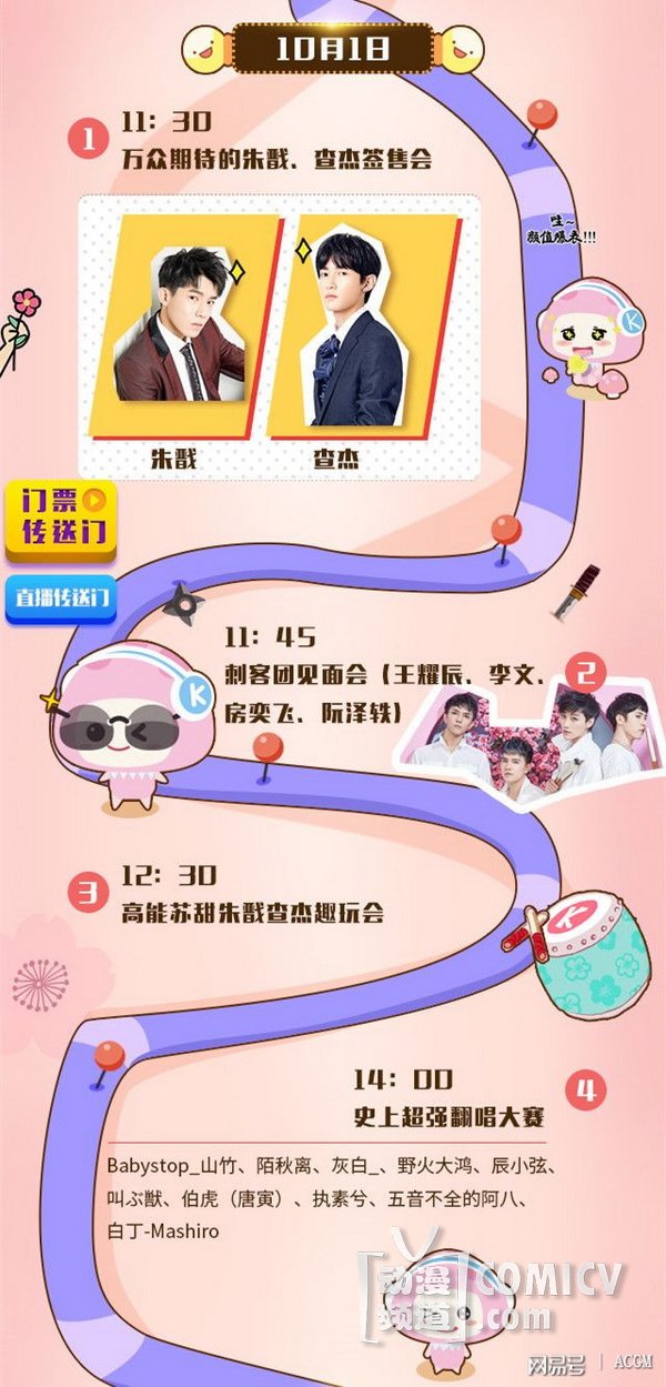 10月1日,上午11:30,万众期待的朱戬、查杰签售会;11:45,颜值爆表的刺客团见面会(王耀辰、阮泽轶、房奕飞、李文);12:30,高能苏甜的朱戬、查杰趣玩会;14:00,史上超强翻唱大赛,Babystop_山竹、陌秋离、灰白_、野火大鸿、辰小弦、叫ぶ?、伯虎(唐寅)、执素兮、五音不全的阿八、白丁-Mashiro古风动漫界高手云集。