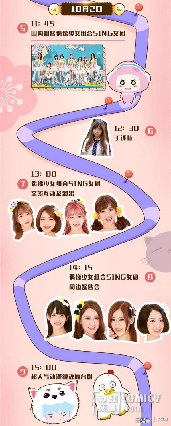 10月2日,上午11:45,偶像少女组合SING女团来袭;12:30,歌手丁译林出场;13:00,SING女团亲密互动及演出;14:15,SING女团签售会;15:00,超人气动漫《银魂》舞台剧。