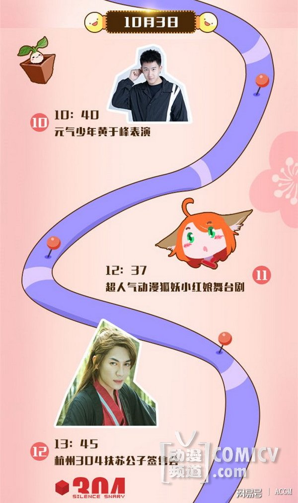 10月3日嘉年华,上午10:40,元气少年黄于峰表演;12:37,超人气动漫《狐妖小红娘》舞台剧;13:45,杭州304扶苏公子签售会。