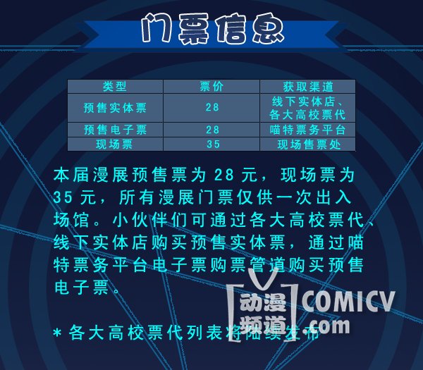本届漫展预售票为28元,现场票为35元,所有漫展门票仅供一次出入场馆。小伙伴们可通过各大高校票代、线下实体店购买预售实体票,通过喵特票务平台电子票购票管道购买预售电子票。