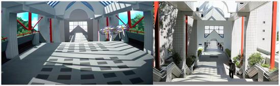 图中学校正门的这一个电梯,通向校园最核心的主干道,若不是有人物在,小编简直分不清这两张图哪张是实景,哪张是动画了。