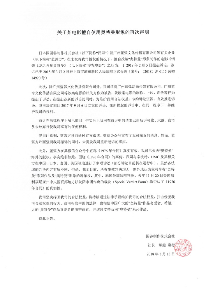 日本国圆谷制作株式会社(以下简称“我司”)就广州蓝弧文化传播有限公司等有关企业(以下简称“蓝弧方”)在未取得我司授权的情况下,擅自改编“奥特曼”形象制作的电影《钢铁飞龙之再见奥特曼》(以下简称''涉案电影”)之行为,于2018年2月5日提起诉讼,该诉己于2018年3月2日被上海市浦东新区人民法院正式受理(案号:(2018)沪0115民初14920号)