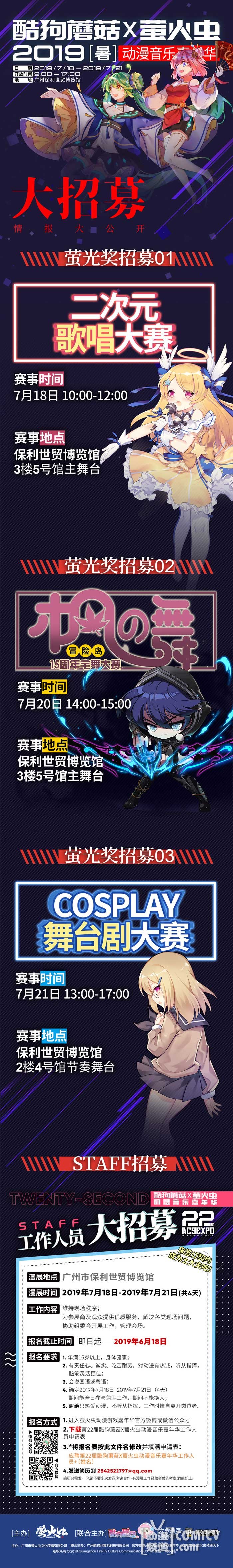2019年7月18日-21日(一共4天)由萤火虫文化主办、酷狗音乐联合主办的第22届酷狗蘑菇×萤火虫动漫音乐嘉年华,盛大登陆广州保利世贸博览馆4/5/6号馆。超百个国创IP来袭,近百位次元红星齐聚给你们带来一场不一样的二次元文化狂欢盛会。